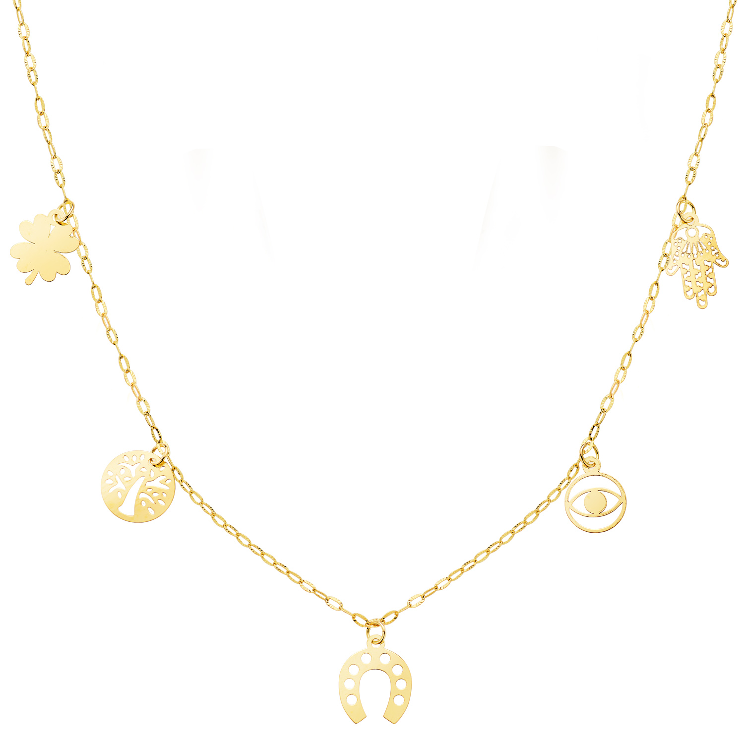 18K GARGANTILLA ORO AMARILLO CON COLGANTES DE LA SUERTE CADENA FORZADA 42 3 CM