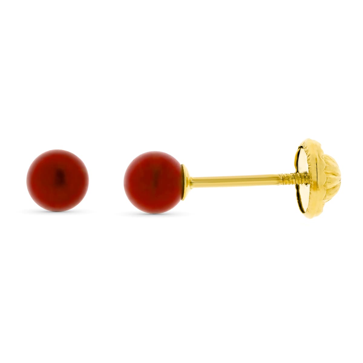 9K PENDIENTES ORO AMARILLO CORAL SINTETICO REDONDO 4 MM. CIERRE TUERCA