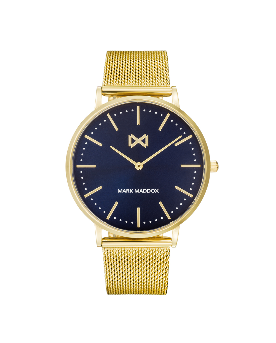 Descripción largaReloj de Hombre Mark Maddox Greenwich tres agujas con la caja y la malla milanesa de acero IP dorado, esfera en azul y los índices en dorado.